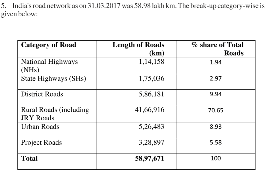 India has the following road network according to the Ministry of Road Transport and Highways Transport Research Wing.