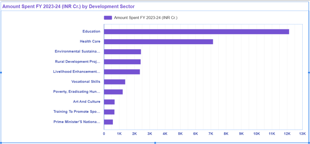 Thematic analysis of CSR spending in India confirms some expected frontrunners—and reveals some glaring blind spots. Healthcare remains the top priority, particularly in the aftermath of COVID-19. From vaccine infrastructure to telemedicine in rural areas, the health sector has seen sustained investment. Next in line is Education & Skilling, with increasing emphasis on digital access, STEM literacy, and employability. With the goal to equip India’s youth for the modern economy.